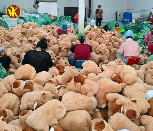 Không chỉ phục vụ thị trường nội địa, các xưởng gia công thú bông, gấu bông xuất khẩu còn liên tục nhận đơn hàng từ Nhật Bản, Hàn Quốc, EU và Mỹ – nơi yêu cầu cực kỳ khắt khe về tiêu chuẩn an toàn, độ bền và tính thẩm mỹ.